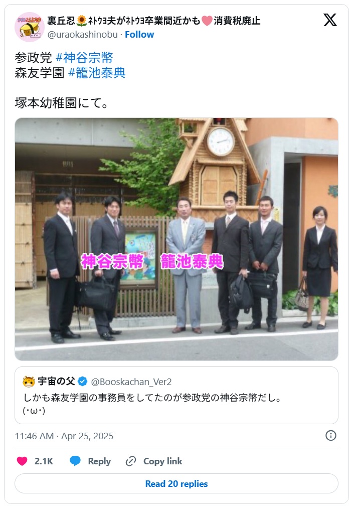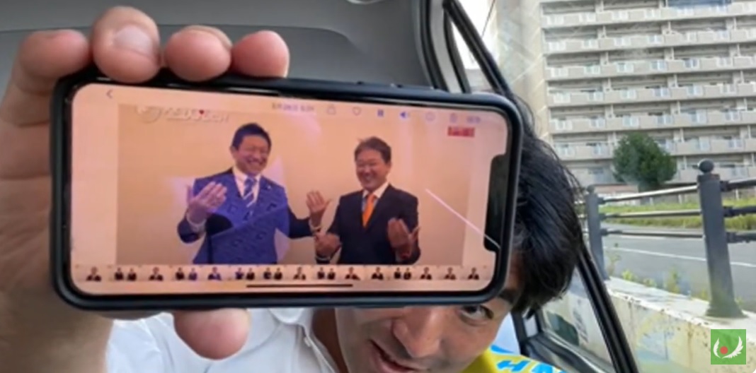 (参政党の党首は、世界中で、マスクとワクチンに対する反対運動が全盛期である間、マスクとワクチンを推進していた。2021年6月26日、この日は、マスクを着用し、ワクチン接種推進を政策に掲げる政治家の応援演説をしている)